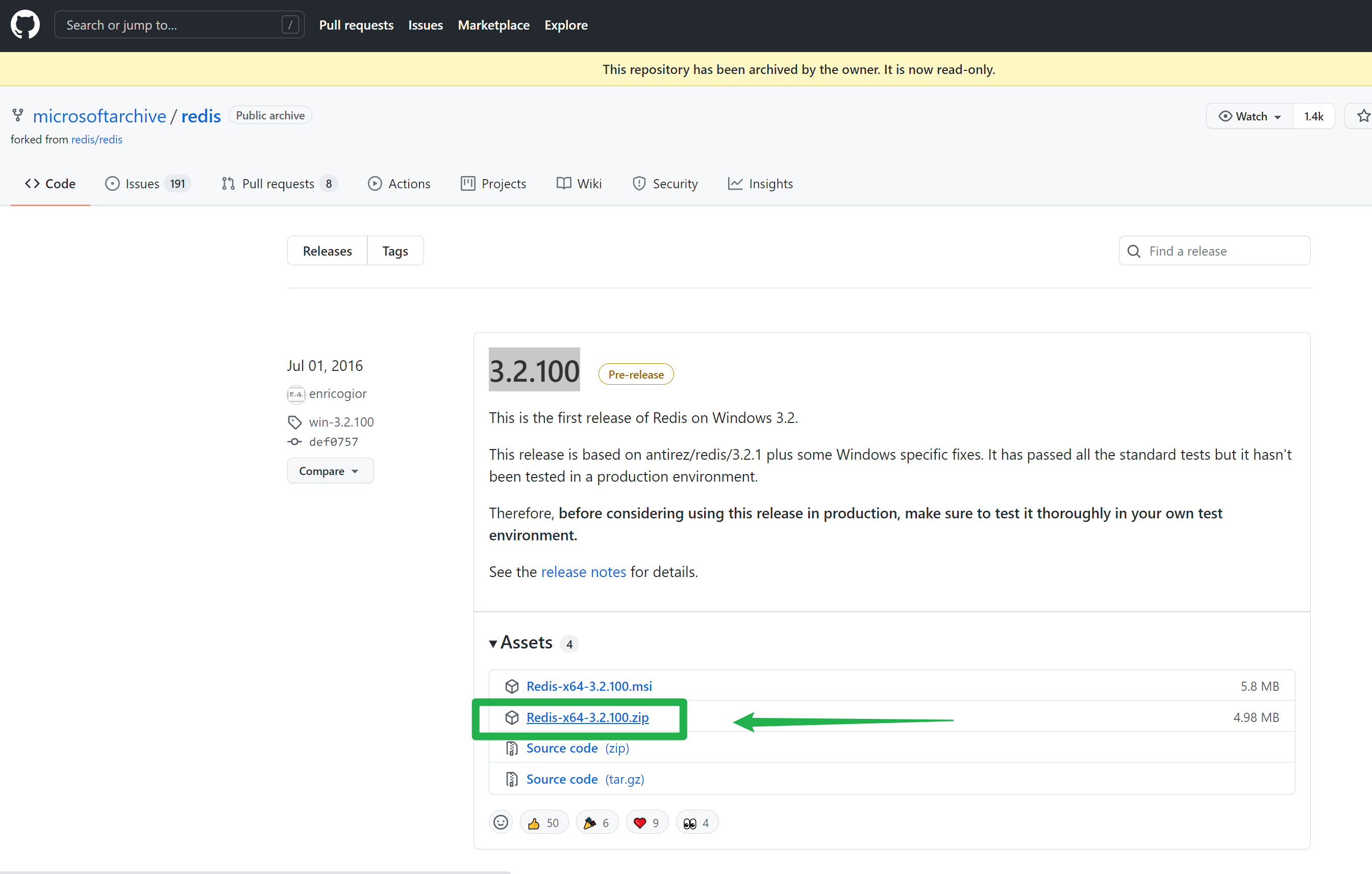 1)在GitHub中下载由Microsoft发布的Windows版Redis文件(当前最新版本为3.2.100, 下载ZIP文件,解压后双击 redis-server.exe 就可以启用一个单机的Reids服务)。下载地址:https://github.com/MicrosoftArchive/redis/releases