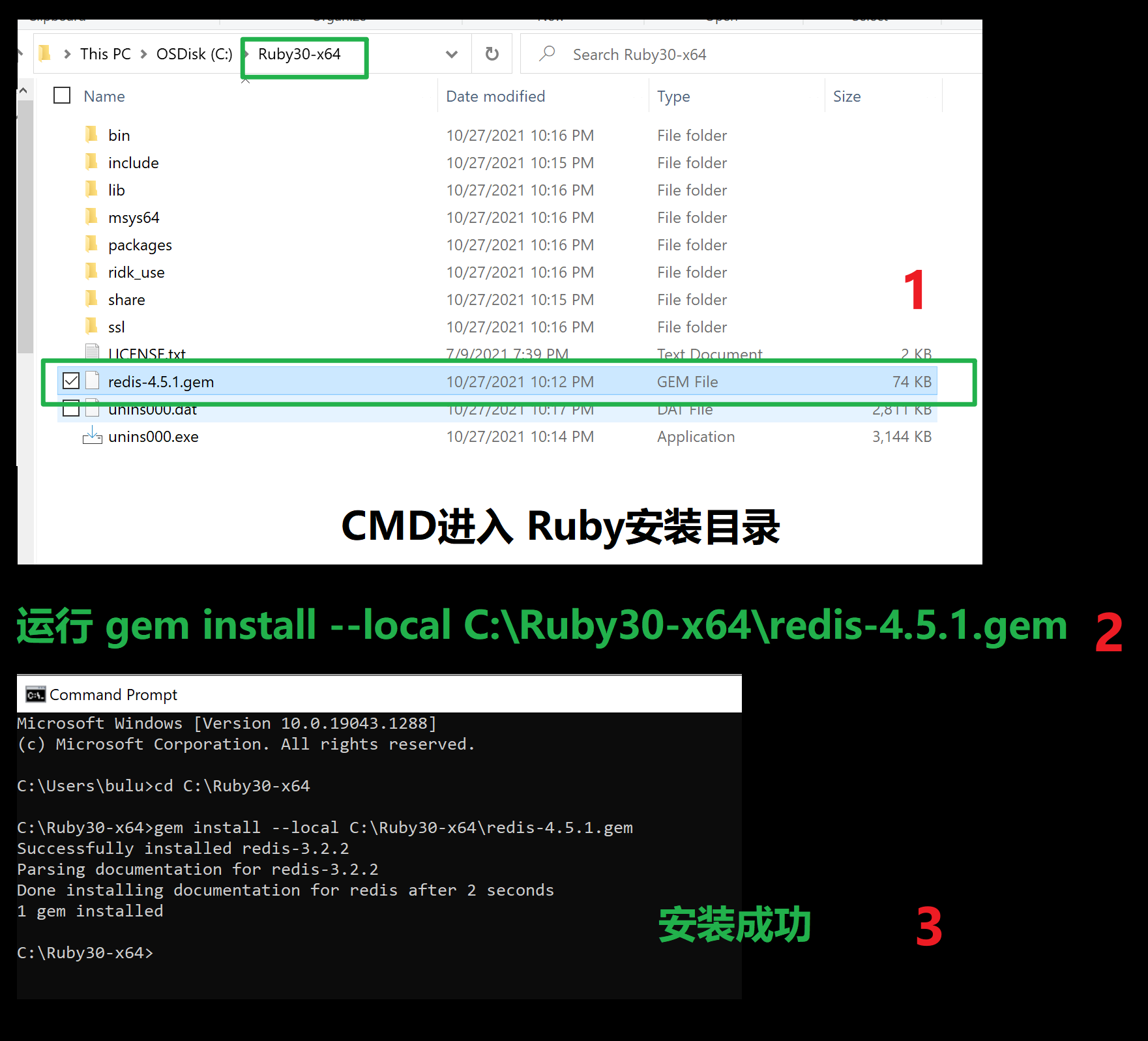复制 redis-4.5.1.gem 文件到Ruby的安装目录,运行 * gem install --local C:\Ruby30-x64\redis-4.5.1.gem * ,等待安装成功。