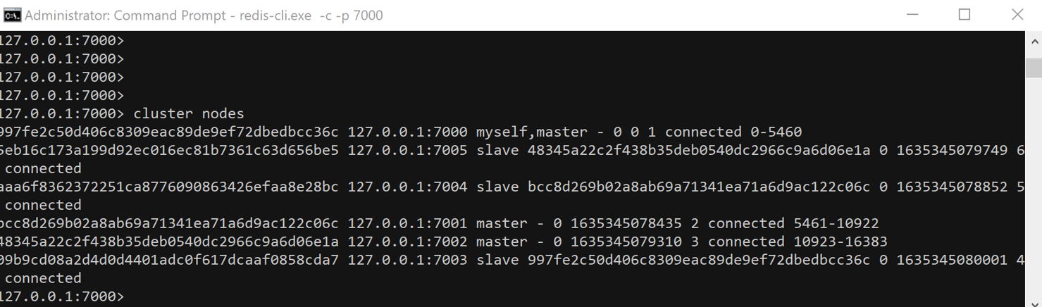 使用 redis-cli.exe 工具(包含Redis的下载ZIP文件中)可以非常容易的查看Cluster Node信息和 Set, Get Key