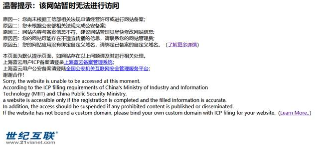 Azure App Service创建后,默认会有一个 Azure App Service创建后,默认会有一个 https://xxxxxxxxxxxxx.chinacloudsites.cn/ 的默认域名,因为中国区域名需要ICP备案,所以Azure平台要求对App Service进行自定义域名,如果使用默认域名访问,会被封堵。出现一个“温馨提示”页面。