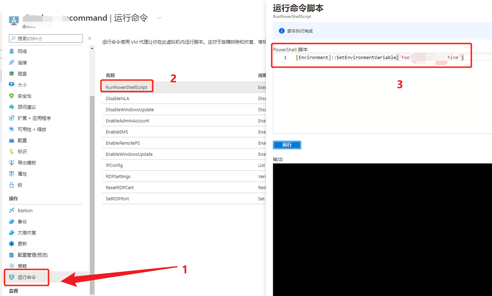 在Azure VM的门户页面中,可以通过 RunPowerShellScript来执行PowerShell脚本,如下图:
