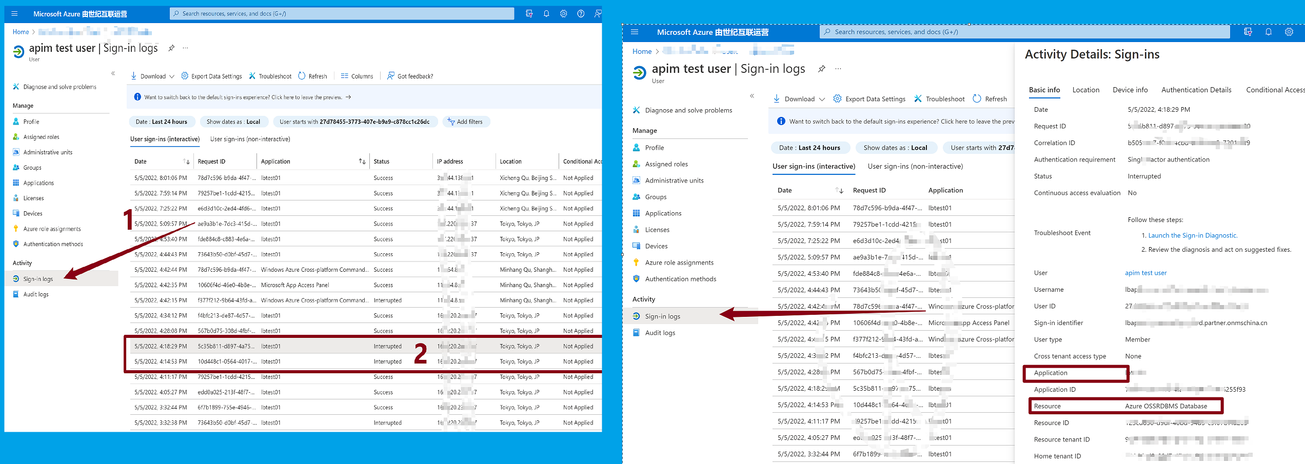 1)进入Azure AD页面,找到当前User的登录日志信息(Sign-in logs),查看失败的记录,在详细记录中,查看Status为 Interrupted的记录,找到 Resource 和Application 信息。在第二步中使用这两个信息。