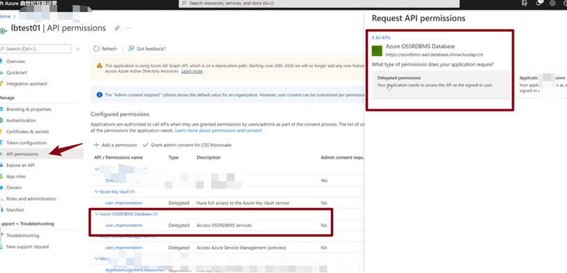 2)回到Azure AD的注册应用页面,找到第一步中的Applicaiton,然后进入API Permission页面。在API Permission页面中点击“Add a Permission”,然后再“APIs my Organization uses”的文本框中输入“Azure OSSRDBMS Database”进行搜索,然后选中它,并赋予“Delegated Permissions”权限。如下图: