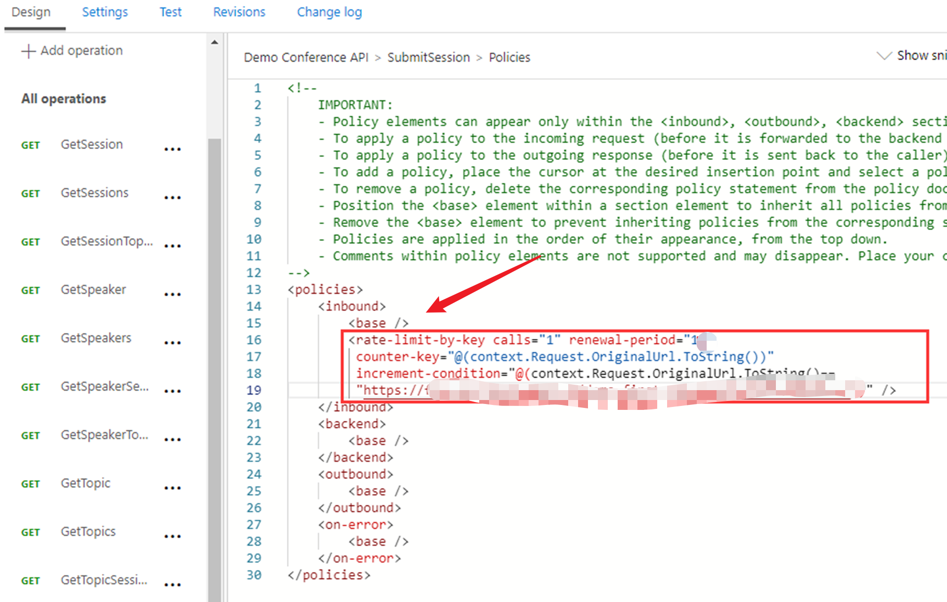 而在Azure APIM的Policy设定文档中,可以通过设定” 按密钥限制调用速率 “ 来限制客户端的访问。同理,可以根据该文档示例写出能限制URL Path的表达式。
