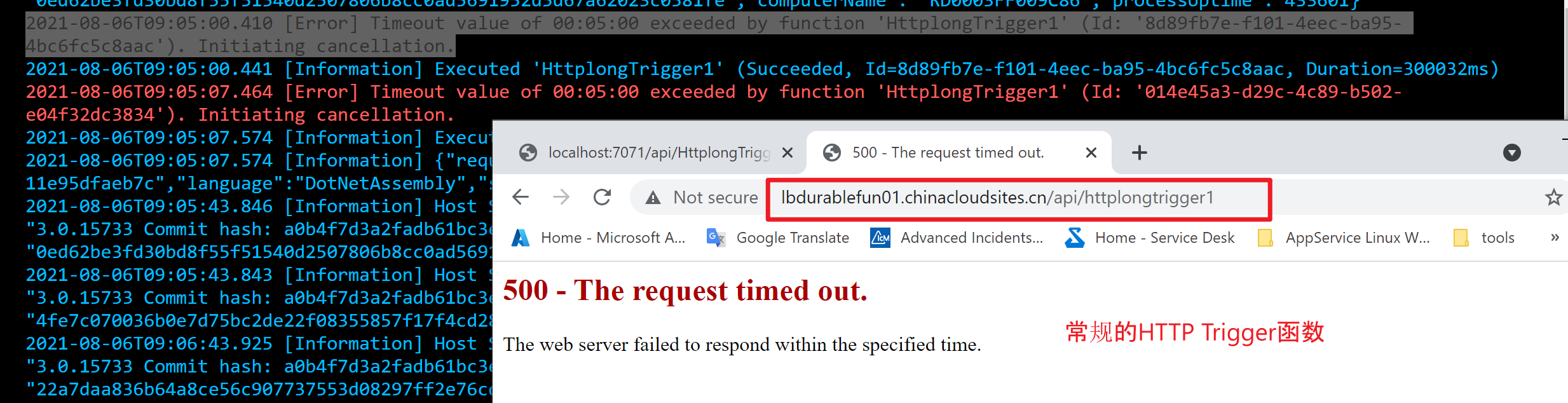 HTTP触发的Function 报错500 - The Request timed out 消息截图: