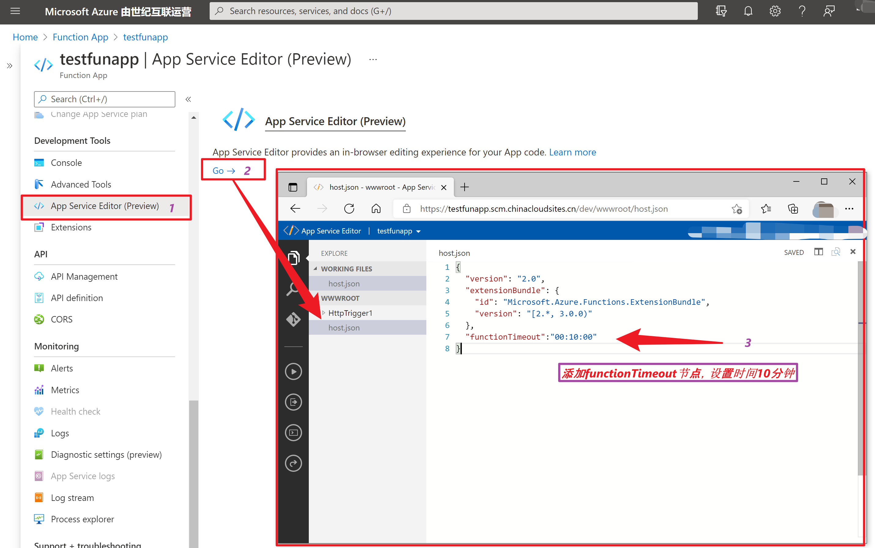 点击“App Service Editor “, 进入源代码查看页面,选择 host.json。 修改 functionTimeout 内容。如没有 functionTimeout,则根据以下格式自行添加。