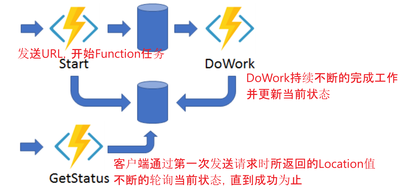 Durable Function 异步 HTTP API 模式: https://docs.microsoft.com/zh-cn/azure/azure-functions/durable/durable-functions-overview?tabs=csharp#pattern-3-async-http-apis
