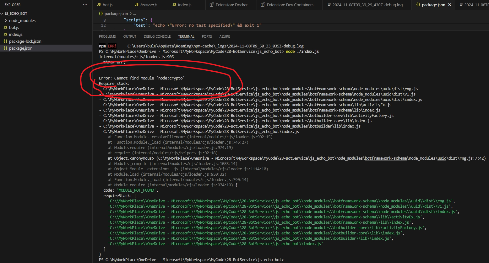 从Github中下载了JavaScript的Bot Service EchoBot实例代码,本地执行,总是报错 Cannot find module 'node:crypto'