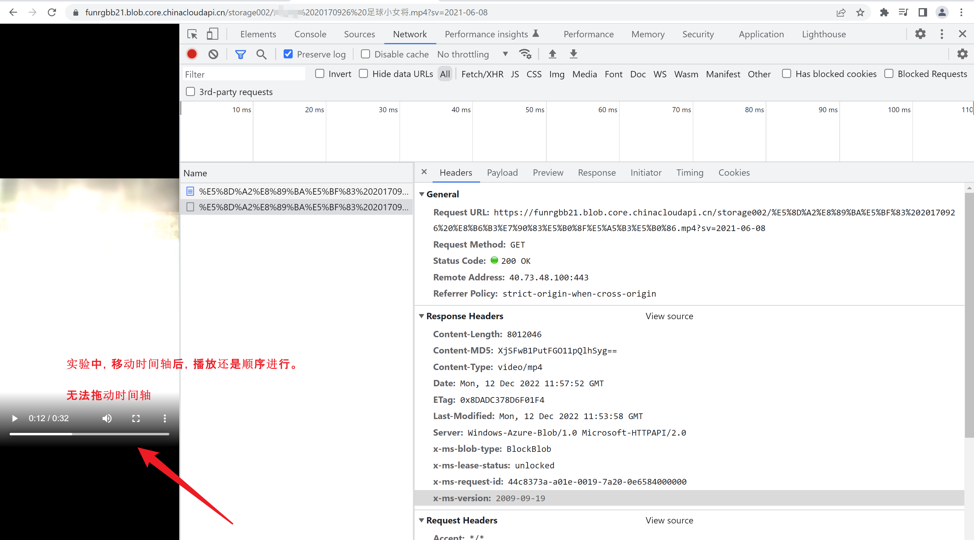 把MP4视频放在Azure的Blob里面,用生成URL在浏览器中打开之后,视频可以正常播放却无法拖拽视频的进度,这是什么情况呢?