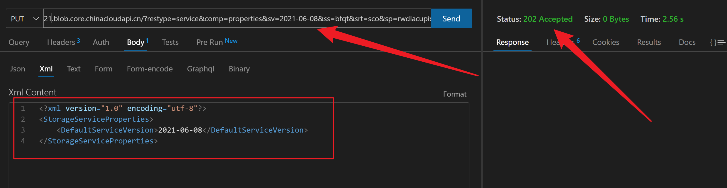 PUT https://<your storage account name>.blob.core.chinacloudapi.cn/?restype=service&comp=properties& <SAS Token, 通过门户生成SAS Token>