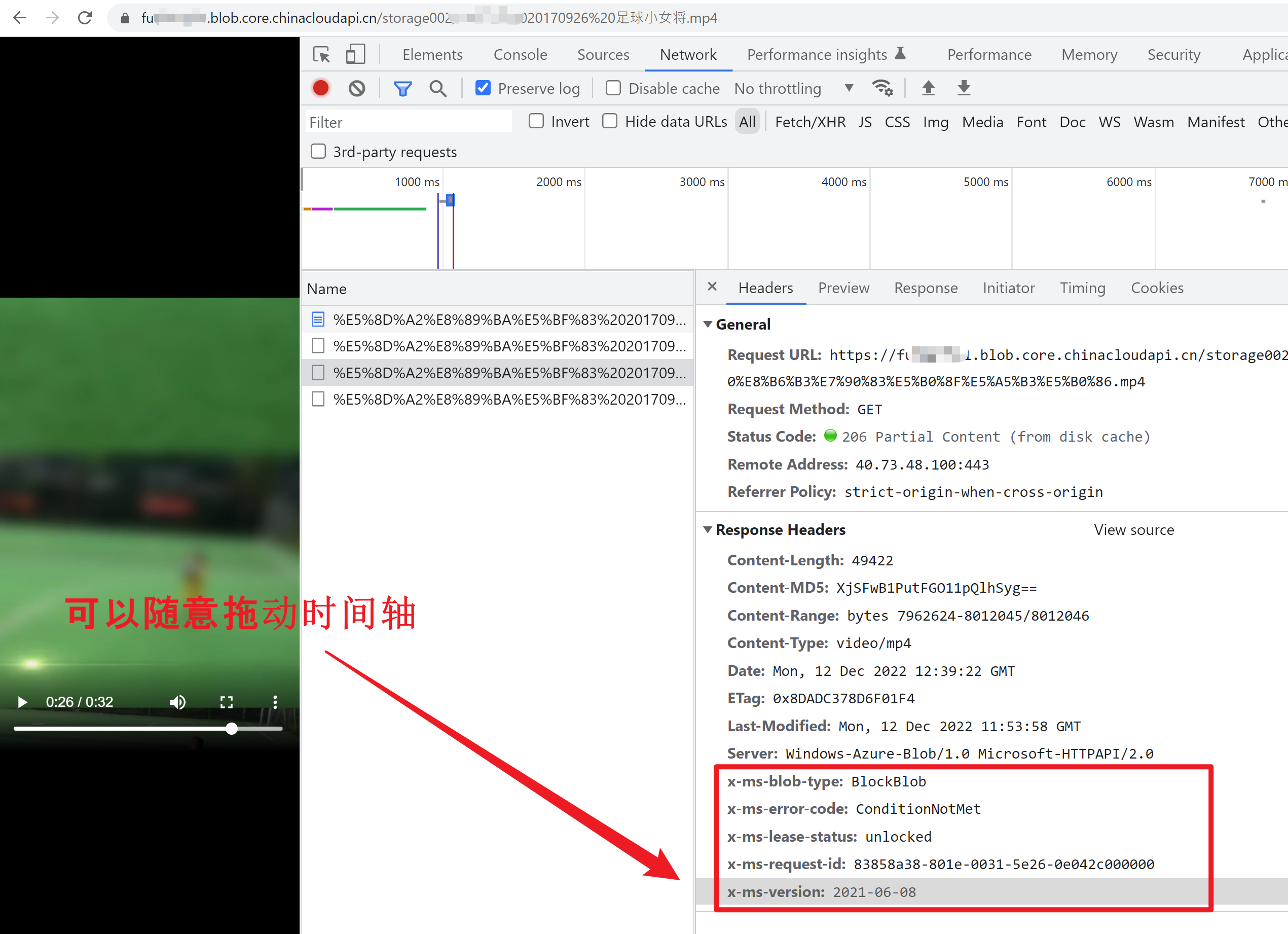 修改完成后,再次查看同一个MP4的播放返回,发现x-ms-version的值已经变为设置的2021-06-08。