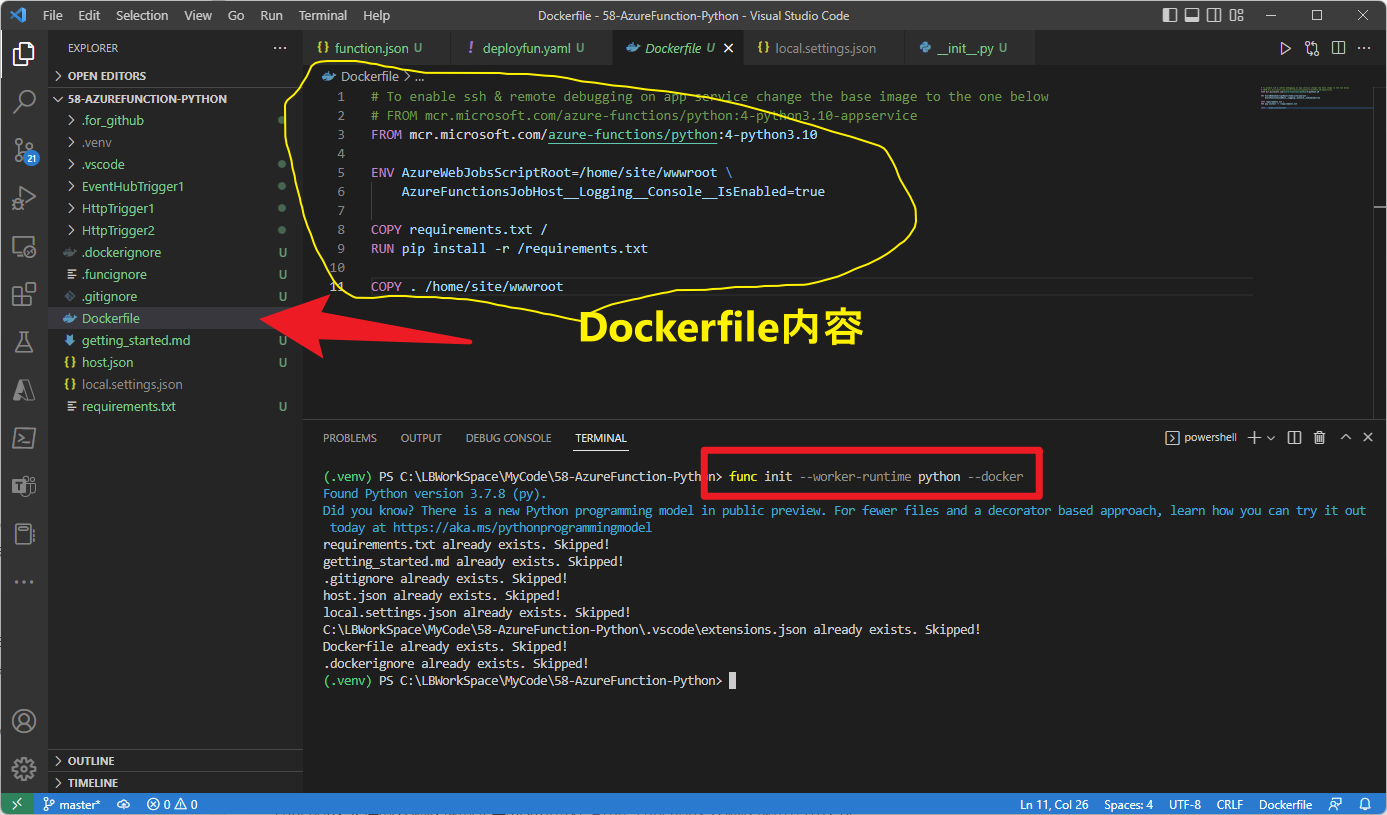 # --docker 选项生成该项目的 Dockerfile,其中定义了适合用于 Azure Functions 和所选运行时的自定义容器 Python