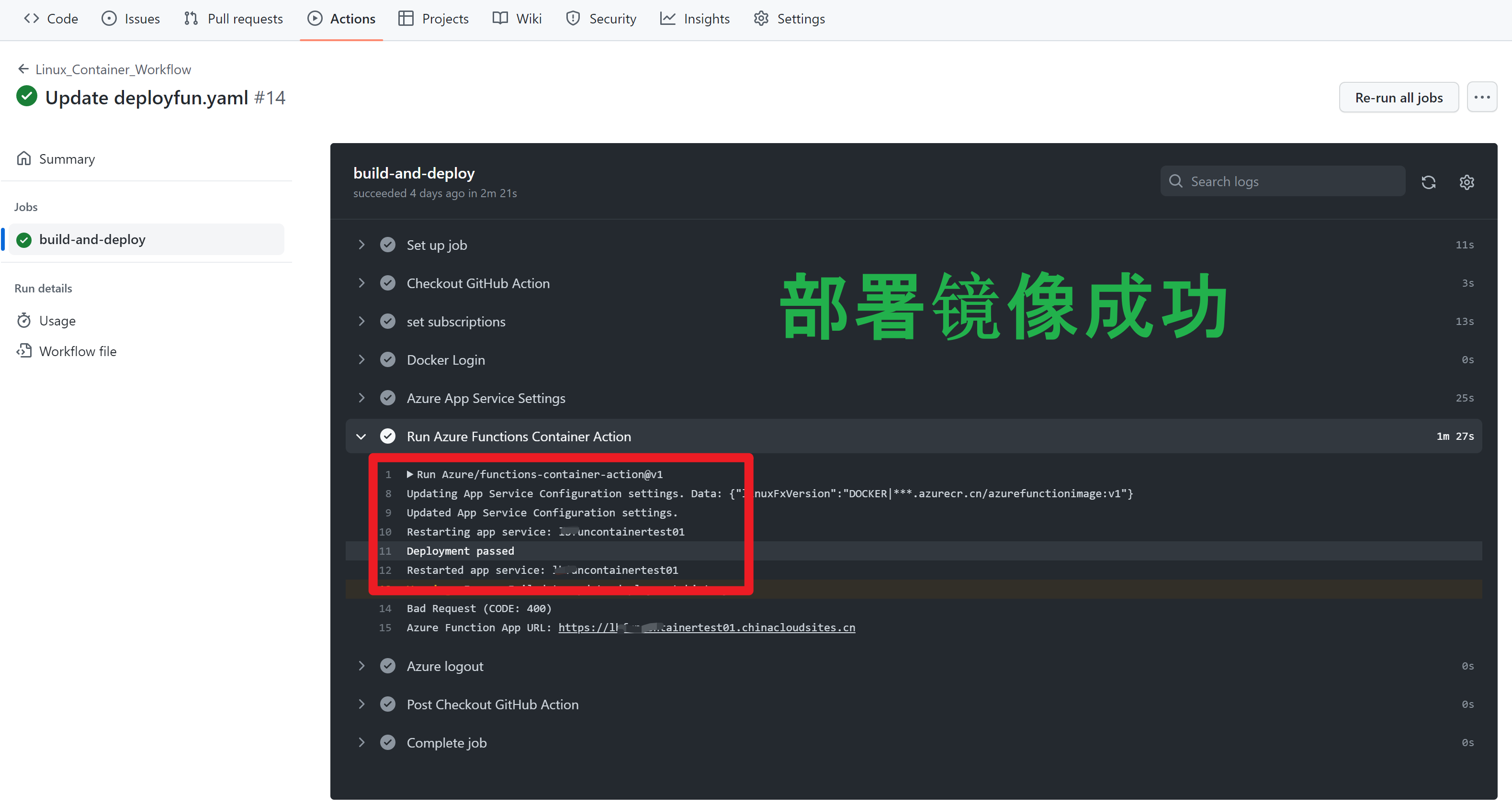 使用Github Action,通过 Azure/functions-container-action@v1 插件来完成 yaml 文件的配置,并成功部署Function Image 的过程记录。