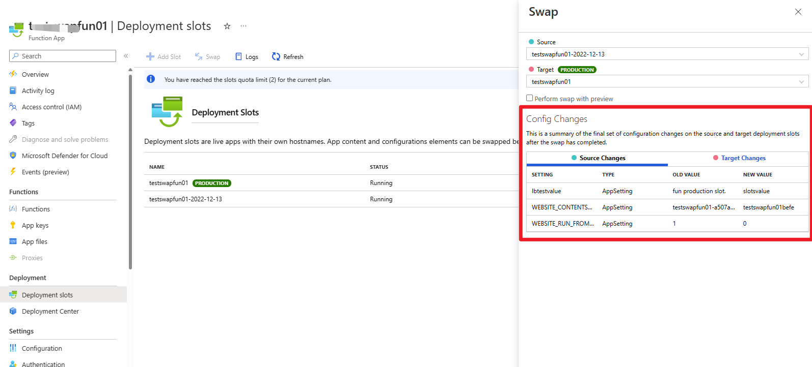 此外,在Azure Funciton门户操作交换槽时,会提示源槽和目标槽的配置变动。如下图: