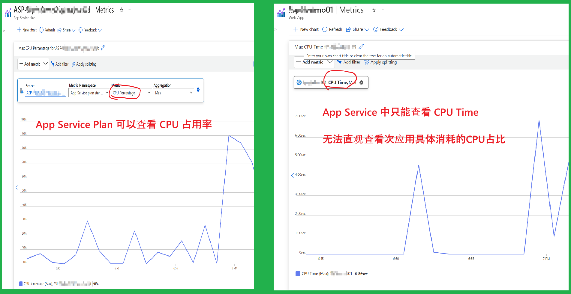 在使用Azure App Service服务时,对于它的CPU占比,从App Service Plan级别可以查看整个实例(vm)资源的CPU占比,而如果在具体的一个App Service服务中,则只能查看到当前应用所消耗的CPU时间,如果需要计算它的占比:需要使用公式【 CPU Time / (CPU核数 * 60 )】估算。