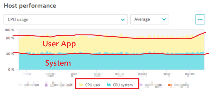 如下图中,应用Host的CPU占比中,系统占比达到了一半。