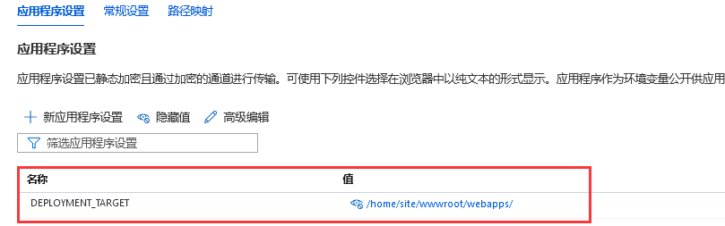 **解决办法是:**在 App Service的 配置页面 --> 应用程序设置 页面中添加 ”DEPLOYMNET_TARGET“,并设置值为:/home/site/wwwroot/webapps/