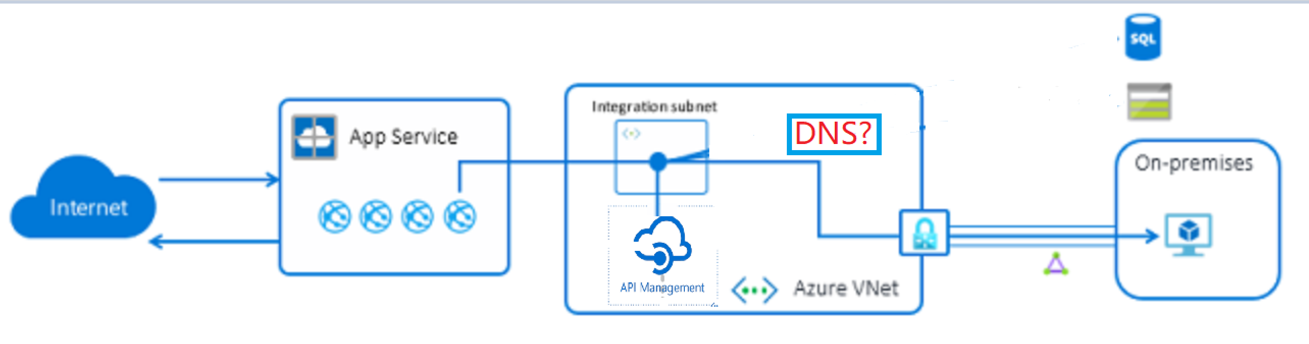 是的,由于APIM配置的是内部虚拟网络,它只能接收从虚拟网络内部发送的请求,而无法接受从公网(Internet)发送的请求。所以App Service需要访问APIM,需要走内部虚拟网络的链路。同时,由于APIM的访问是通过域名访问,所以也必须需要DNS服务器来解析内网IP地址。