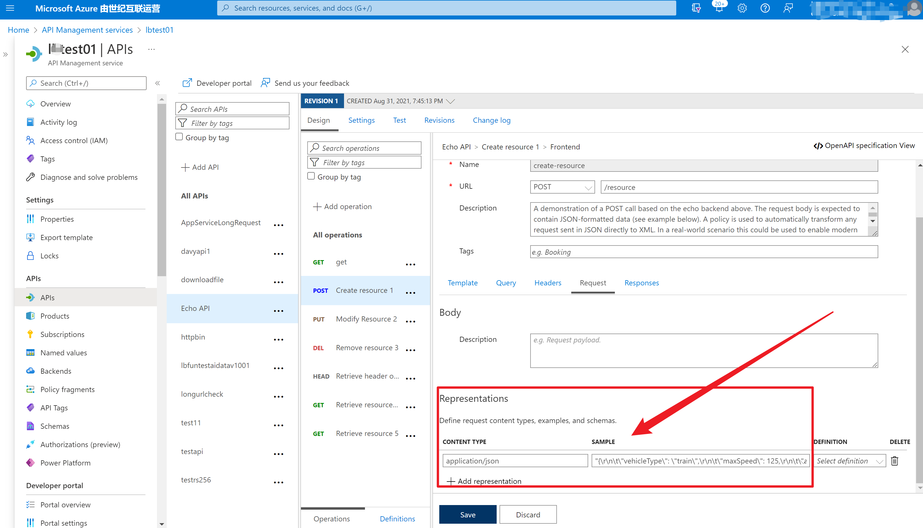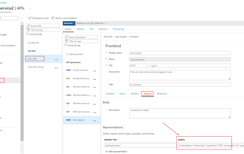 在使用API Management服务时,以Echo API(默认创建)举例,它会在Request的body部分默认设置一个SAMPLE指,这样在测试接口时候,就会有默认的Body内容,我们只需要根据JSON值就可以了。测试非常便捷。
