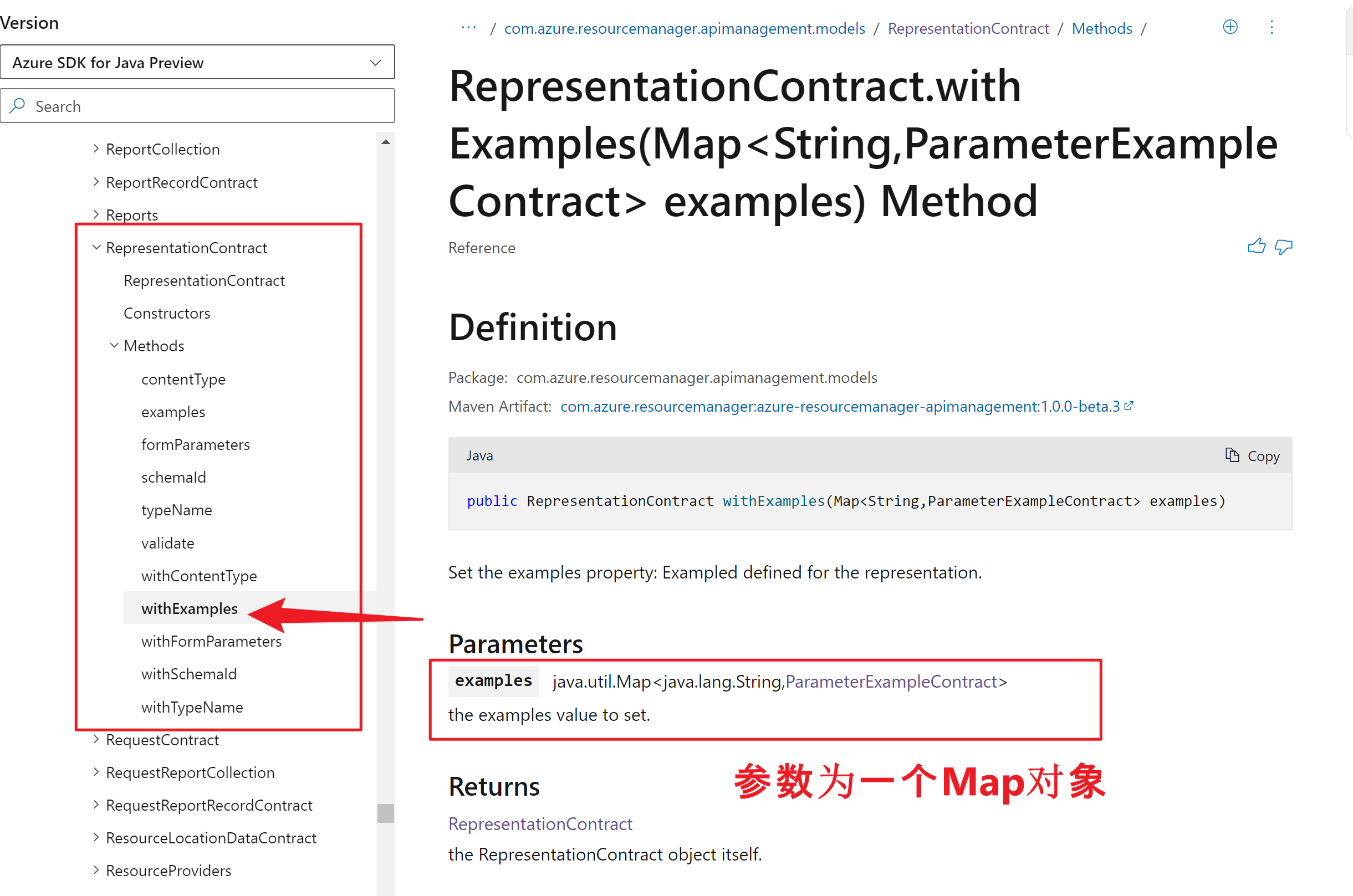RepresentationContract.withExamples(Map<String,ParameterExampleContract> examples) Method : https://docs.microsoft.com/en-us/java/api/com.azure.resourcemanager.apimanagement.models.representationcontract.withexamples?view=azure-java-preview