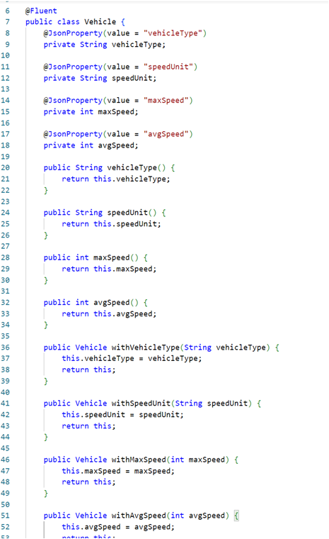 Vehicle vehicle = new Vehicle().withVehicleType("vehicleType").withSpeedUnit("KM").withMaxSpeed(125).withAvgSpeed(90);