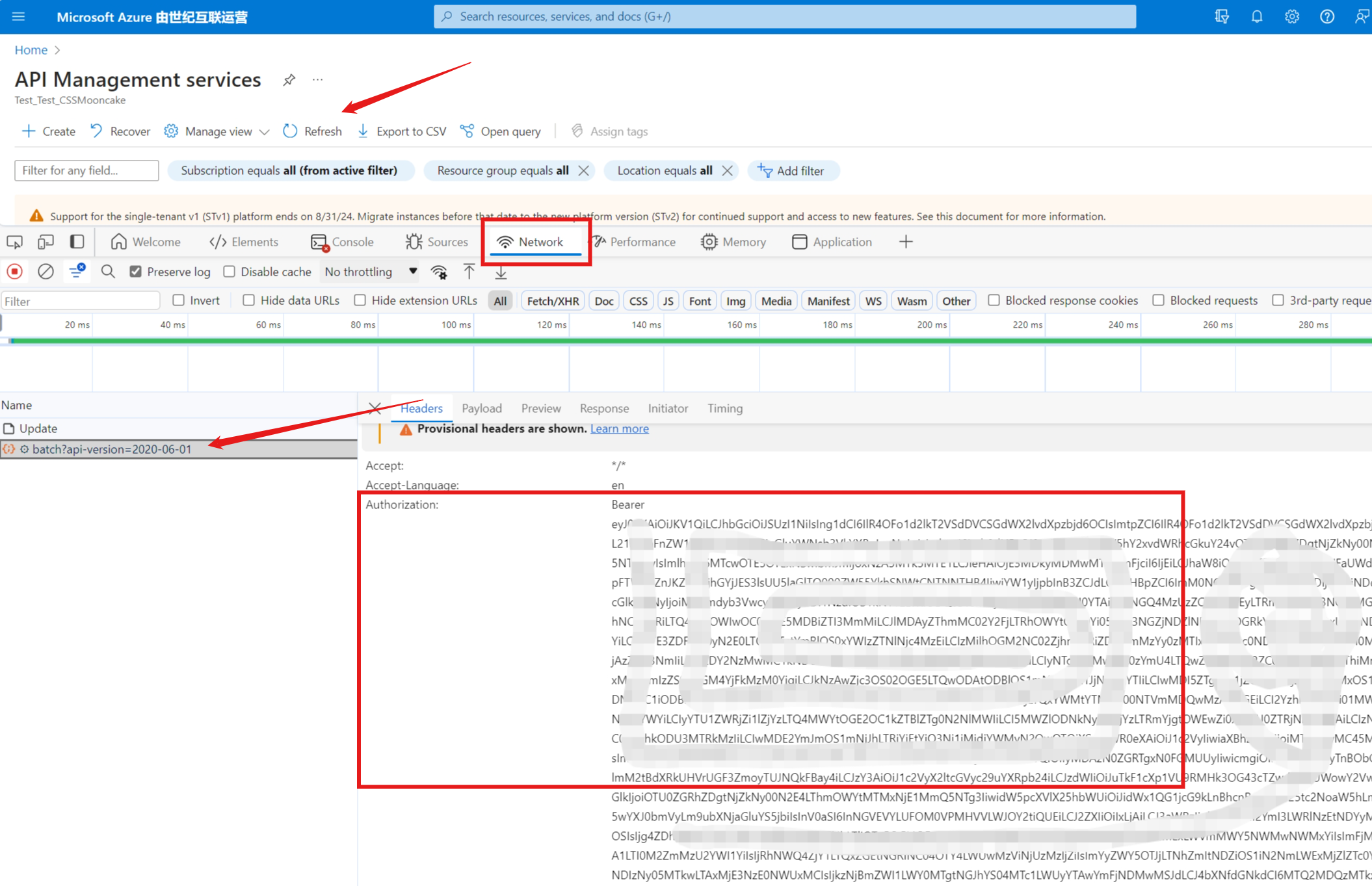 *** 注:**1,2步骤中的请求都需要获取Authorization Token,临时获取方式为 “在Azure APIM门户页面,通过F12(浏览器开发者工具), 查看Network中的请求,从任何一个请求中获取Authorzation Bearer Token即可”。