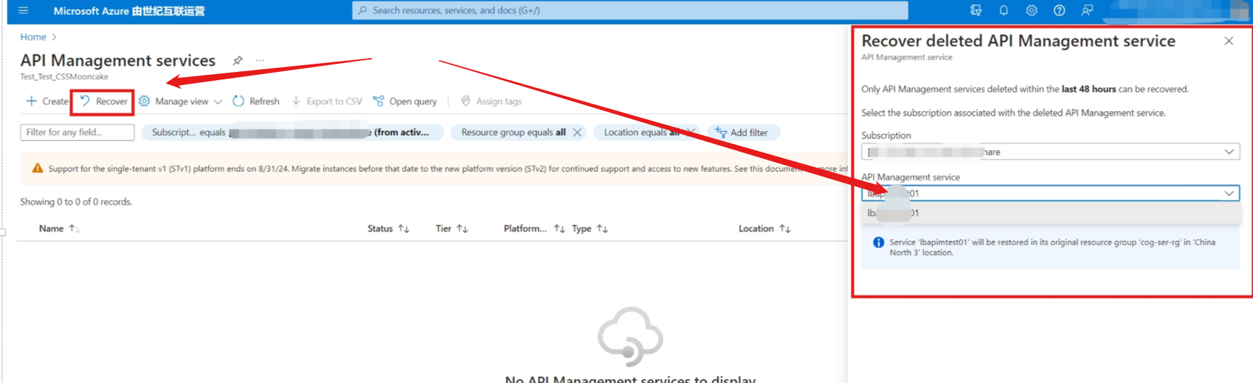 想恢复删除的内容,但是从门户上查看没有发现有可以操作的方面。 (错误,Azure APIM门户已经支持“一键恢复”功能:Recover deleted API Management service - Microsoft Azure 由世纪互联运营)