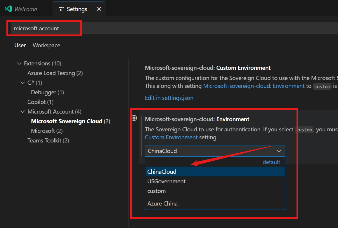 设置 --> 输入“microsoft account” 关键字过滤 --> 修改Environment 值为ChinaCloud