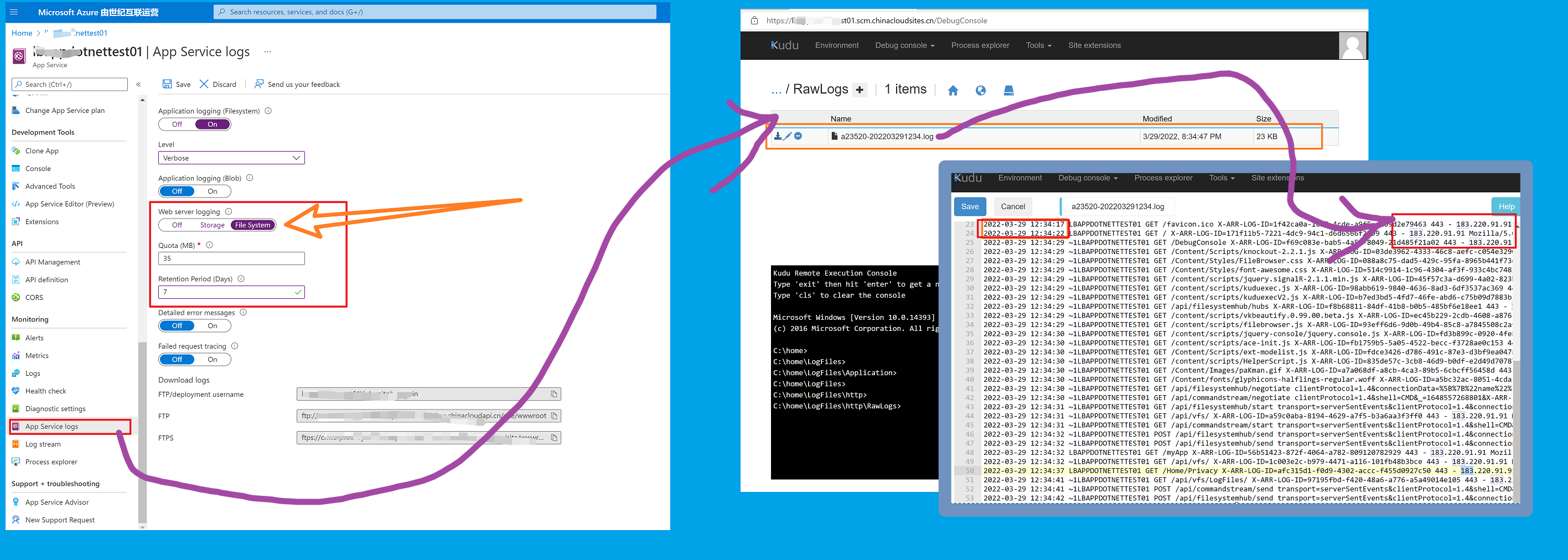 访问日志文件:https://docs.azure.cn/zh-cn/app-service/troubleshoot-diagnostic-logs#access-log-files