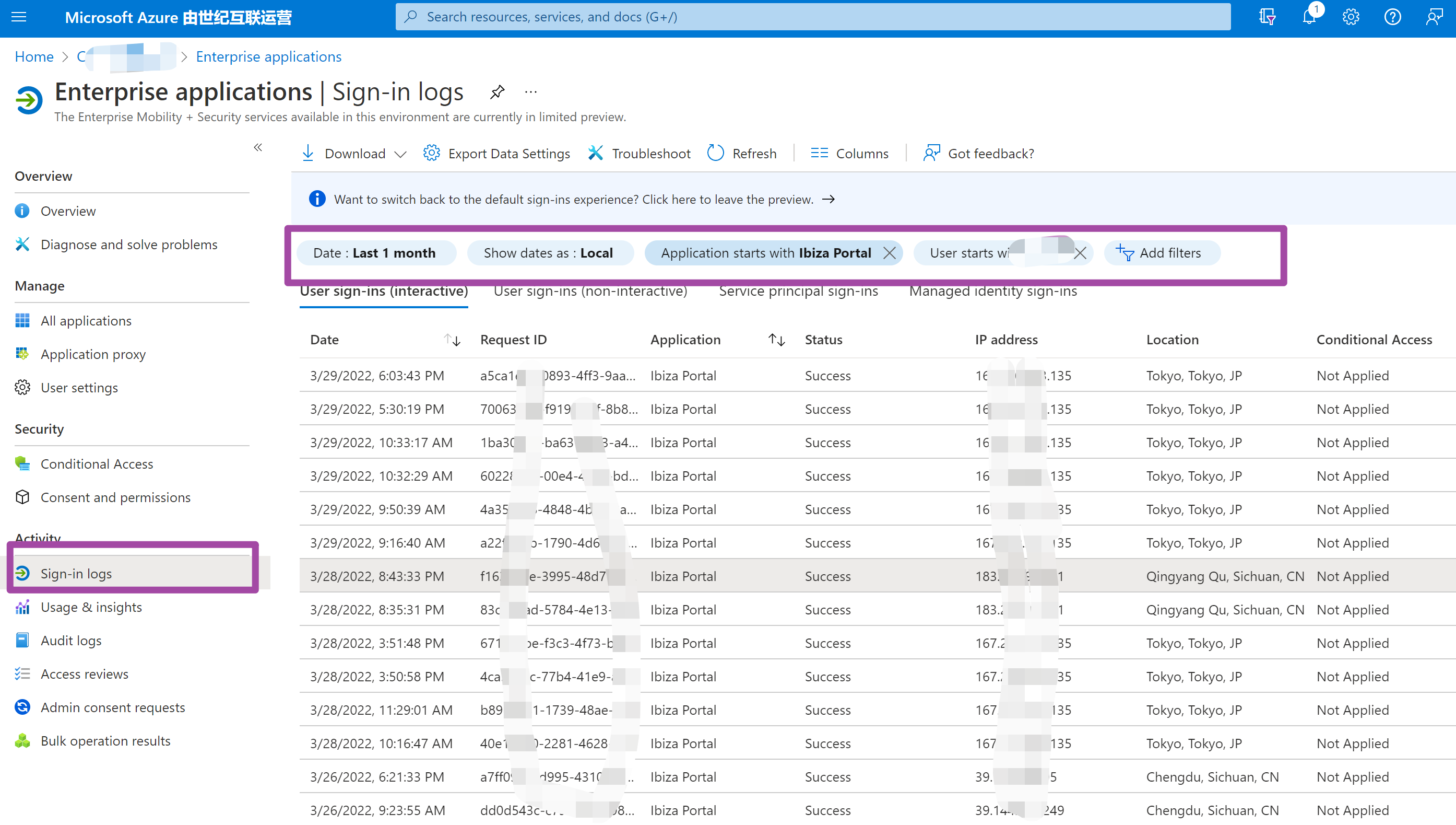 四:Azure AD的登录日志是否可以查看到某个应用的登录情况呢?或者是Azure用户的登录情况