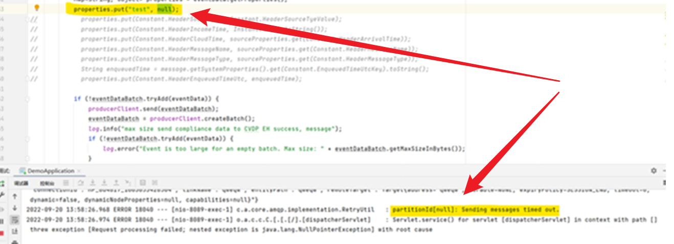通过实验,添加 properties.put("test",null); 消息发送时,返回** **partitionId[null]: Sending messages timed out 异常。如下图: