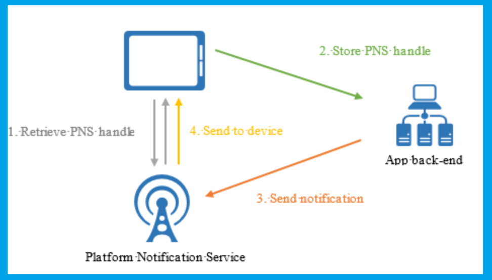 推送通知通过称为平台通知系统 (PNS) 的特定于平台的基础结构进行传送。 它们提供基本的推送功能,使用提供的句柄向设备传送消息,没有通用接口。 若要跨应用的 Android、iOS 和 Windows 版本向所有客户发送通知,开发人员必须分别使用 Apple Push Notification 服务 (APNS) 和 Windows 通知服务 (WNS)、百度中心。