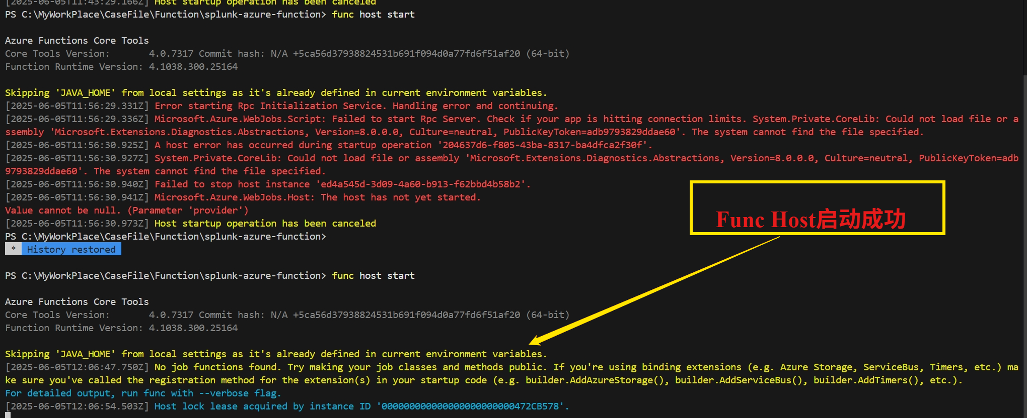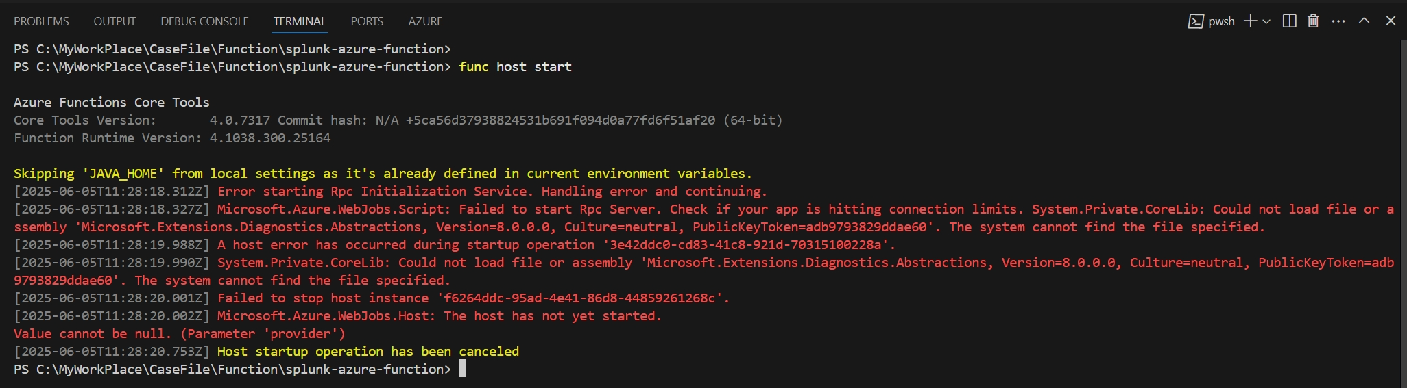 Skipping 'JAVA_HOME' from local settings as it's already defined in current environment variables. [2025-06-05T11:28:18.312Z] Error starting Rpc Initialization Service. Handling error and continuing. [2025-06-05T11:28:18.327Z] Microsoft.Azure.WebJobs.Script: Failed to start Rpc Server. Check if your app is hitting connection limits. System.Private.CoreLib: Could not load file or assembly 'Microsoft.Extensions.Diagnostics.Abstractions, Version=8.0.0.0, Culture=neutral, PublicKeyToken=adb9793829ddae60'. The system cannot find the file specified. [2025-06-05T11:28:19.988Z] A host error has occurred during startup operation '3e42ddc0-cd83-41c8-921d-70315100228a'. [2025-06-05T11:28:19.990Z] System.Private.CoreLib: Could not load file or assembly 'Microsoft.Extensions.Diagnostics.Abstractions, Version=8.0.0.0, Culture=neutral, PublicKeyToken=adb9793829ddae60'. The system cannot find the file specified. [2025-06-05T11:28:20.001Z] Failed to stop host instance 'f6264ddc-95ad-4e41-86d8-44859261268c'. [2025-06-05T11:28:20.002Z] Microsoft.Azure.WebJobs.Host: The host has not yet started. Value cannot be null. (Parameter 'provider') [2025-06-05T11:28:20.753Z] Host startup operation has been canceled