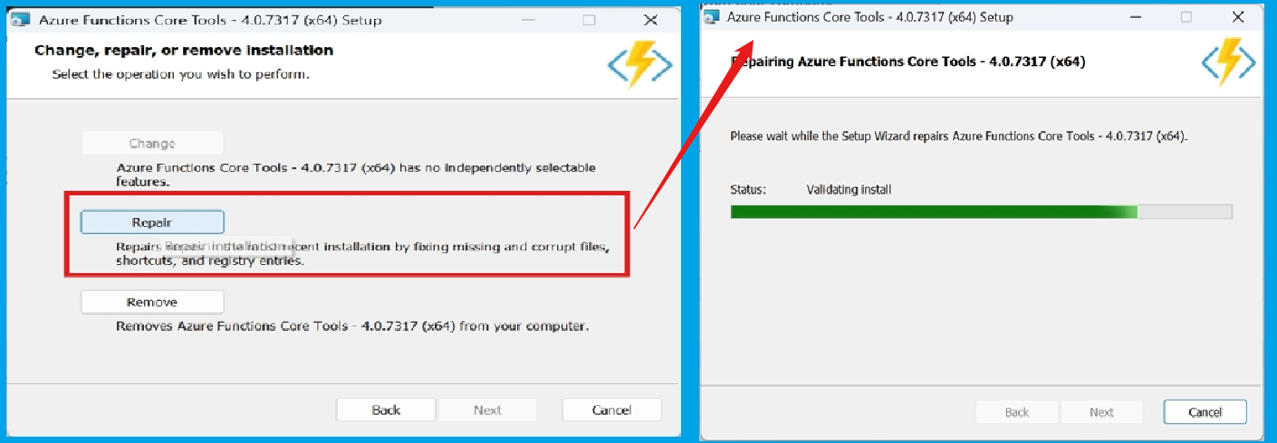 1) 重新下载Function Core Tools:(https://docs.azure.cn/zh-cn/azure-functions/functions-run-local?tabs=windows%2Cisolated-process%2Cnode-v4%2Cpython-v2%2Chttp-trigger%2Ccontainer-apps&pivots=programming-language-csharp#install-the-azure-functions-core-tools) 并安装修复旧版本Azure Function Core Tools