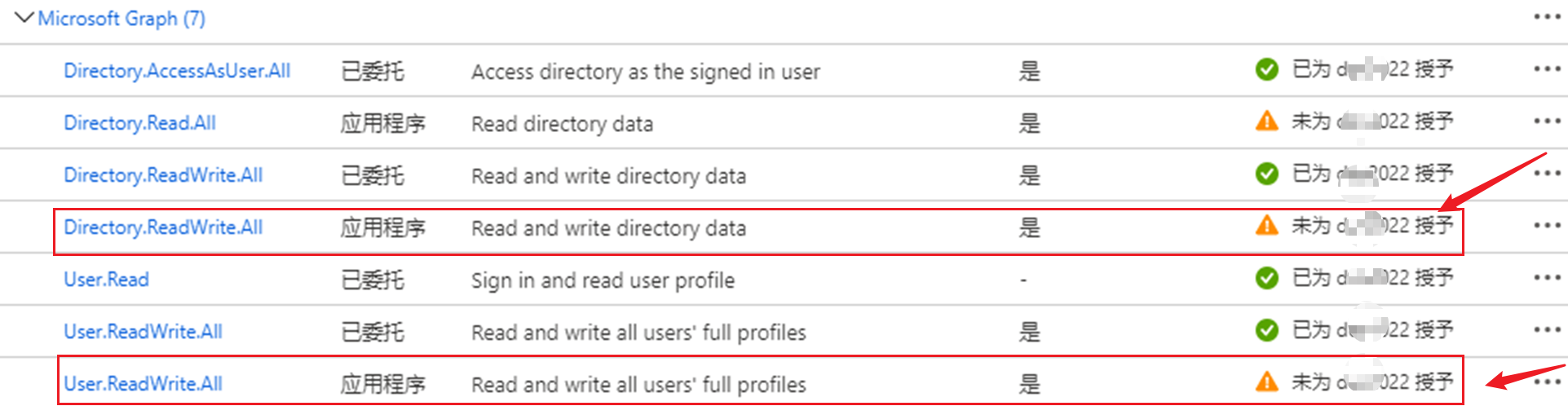 所以可以在AAD Application中查看当前的API Permission是否包含并被授予权限。如下图中,虽然包含了权限,但没有被Admin授予权限