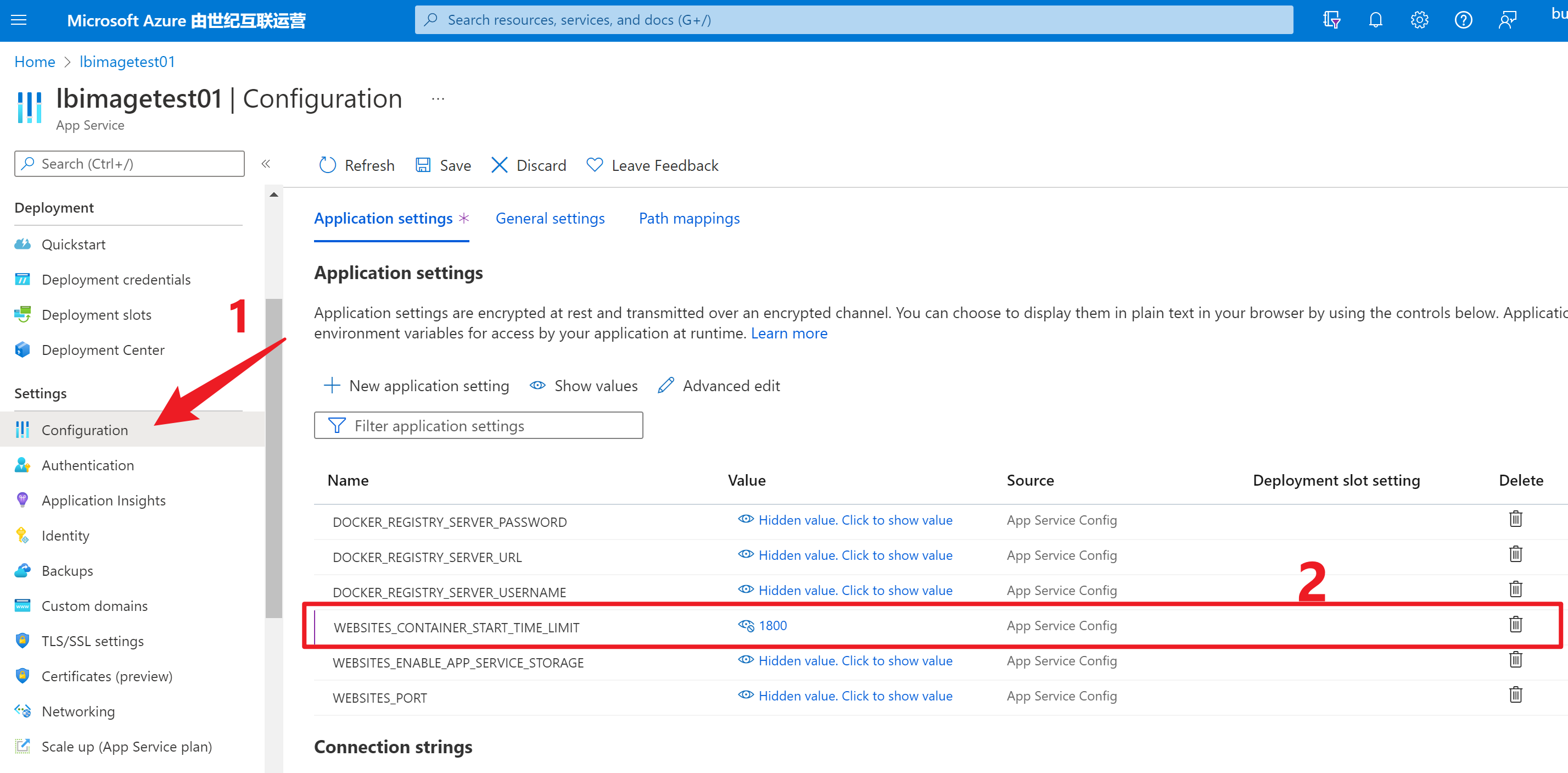 所以只要在App Service的配置页面,添加 **WEBSITES_CONTAINER_START_TIME_LIMIT **参数,可以设置它的最大值达到30分钟(1800秒)。