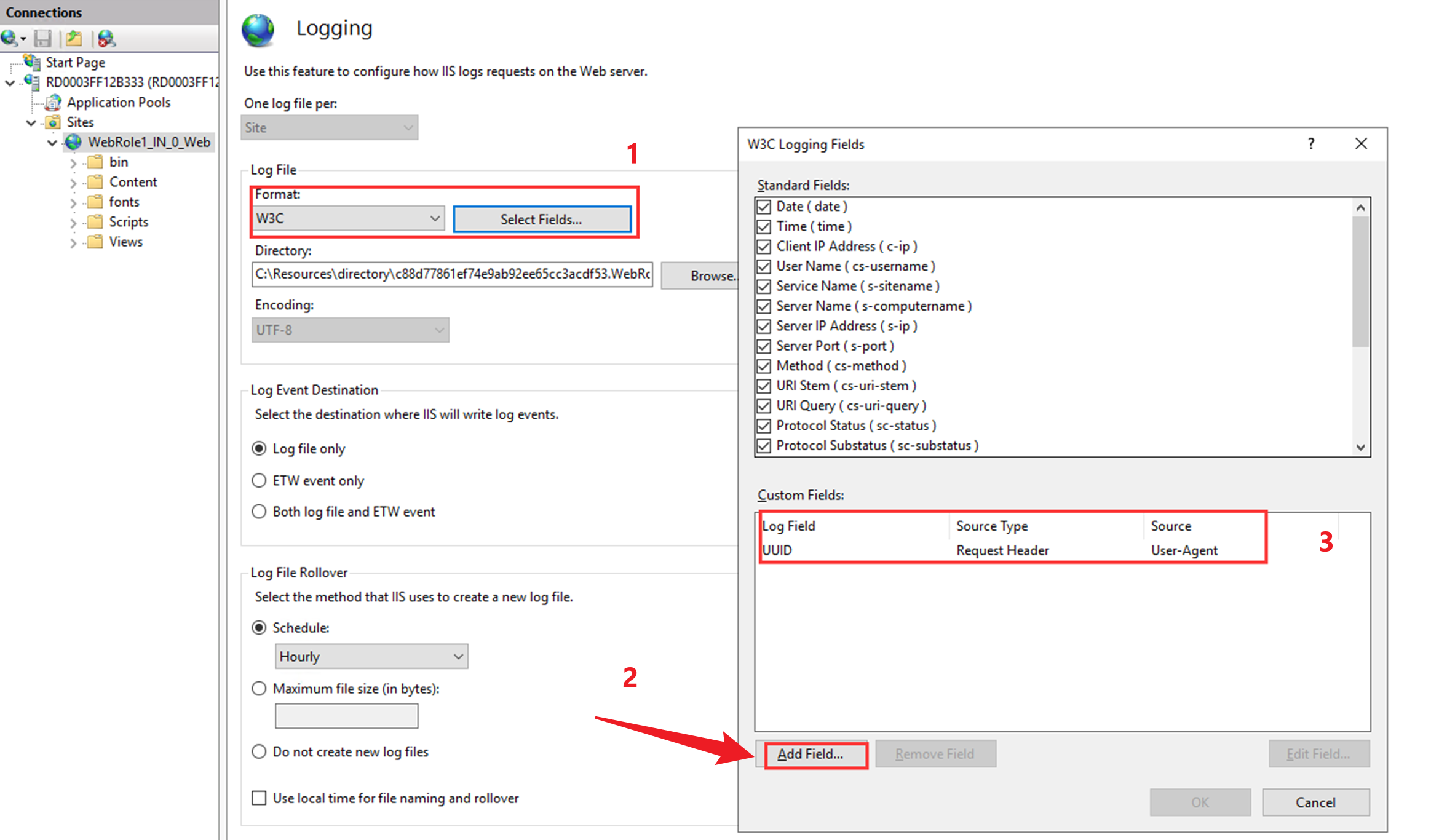 Adding Custom Fields to a Log File for a Site <add> : https://docs.microsoft.com/en-us/iis/configuration/system.applicationhost/sites/site/logfile/customfields/add#sample-code