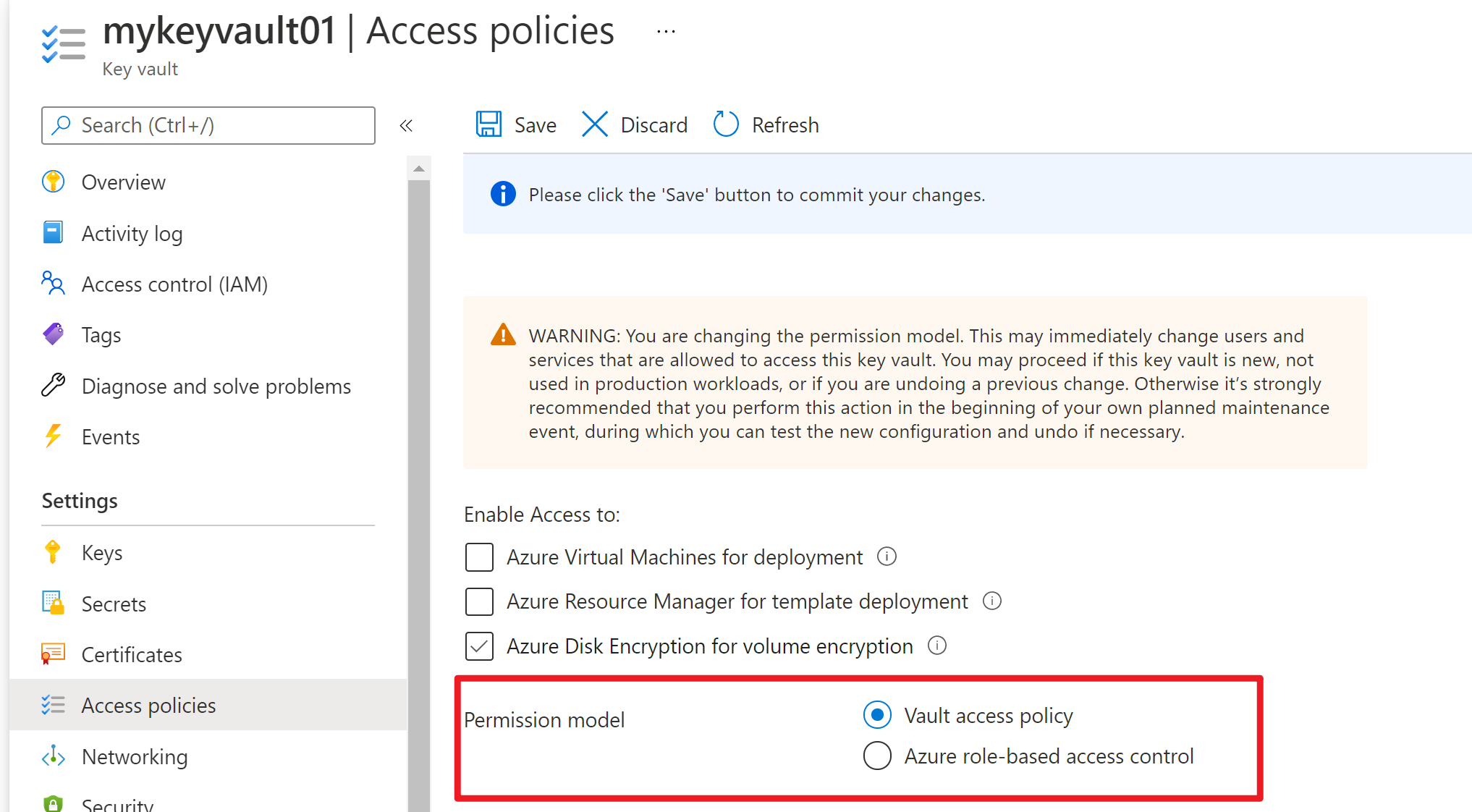 本文的问题,就是解决数据平面中如何实现最小粒度的访问授权。在Key Vault的Access Policy的设置中,两种授权模式的选择分别为: ”Vault Access Policy“ 和 ”Azure role-based access control (RBAC)“。