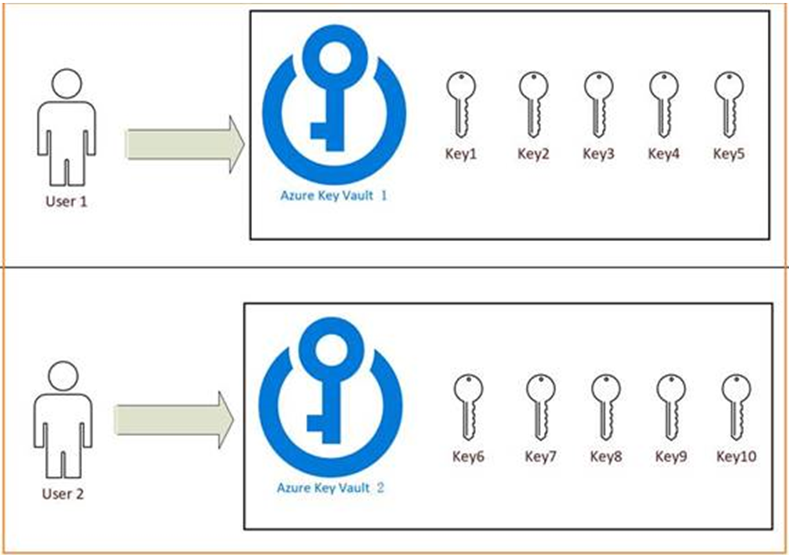 1) 当使用Vault Access Policy时,是没有办法实现不同步用户访问不同Key的需求。只能通过变通(workaround)的方式,把10个Key分别存储到两个不同的Key Vault中,User 1和User 2单独访问各自的Key Vault。