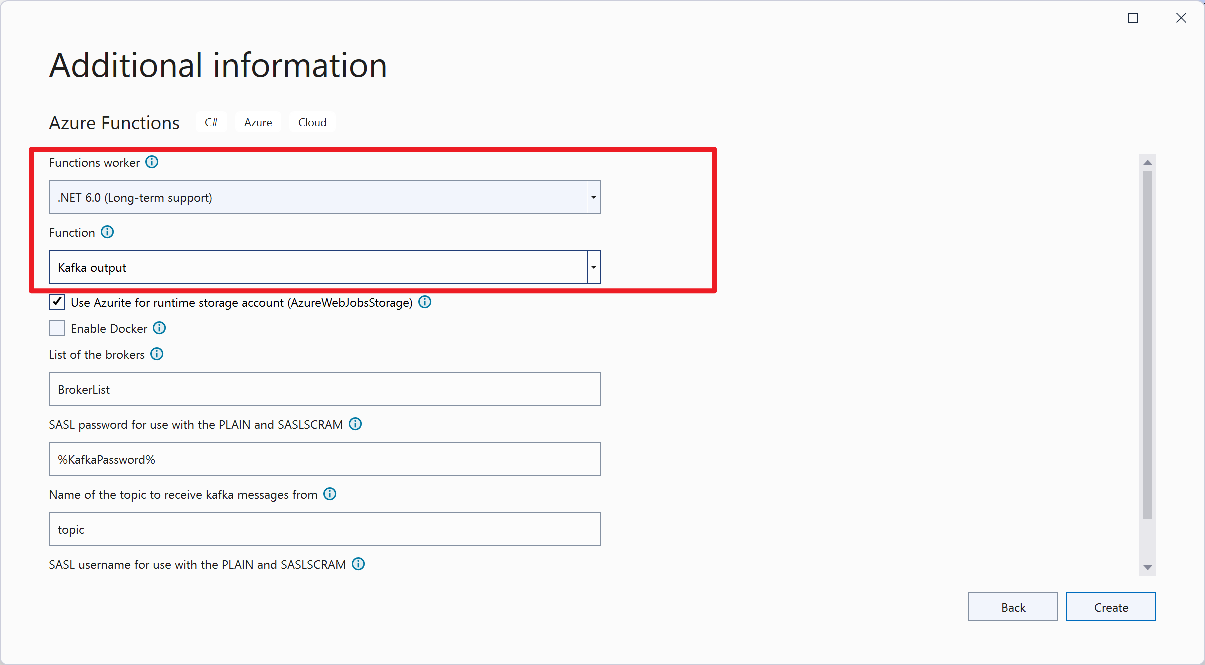 // Add `BrokerList` and `KafkaPassword` to the local.settings.json