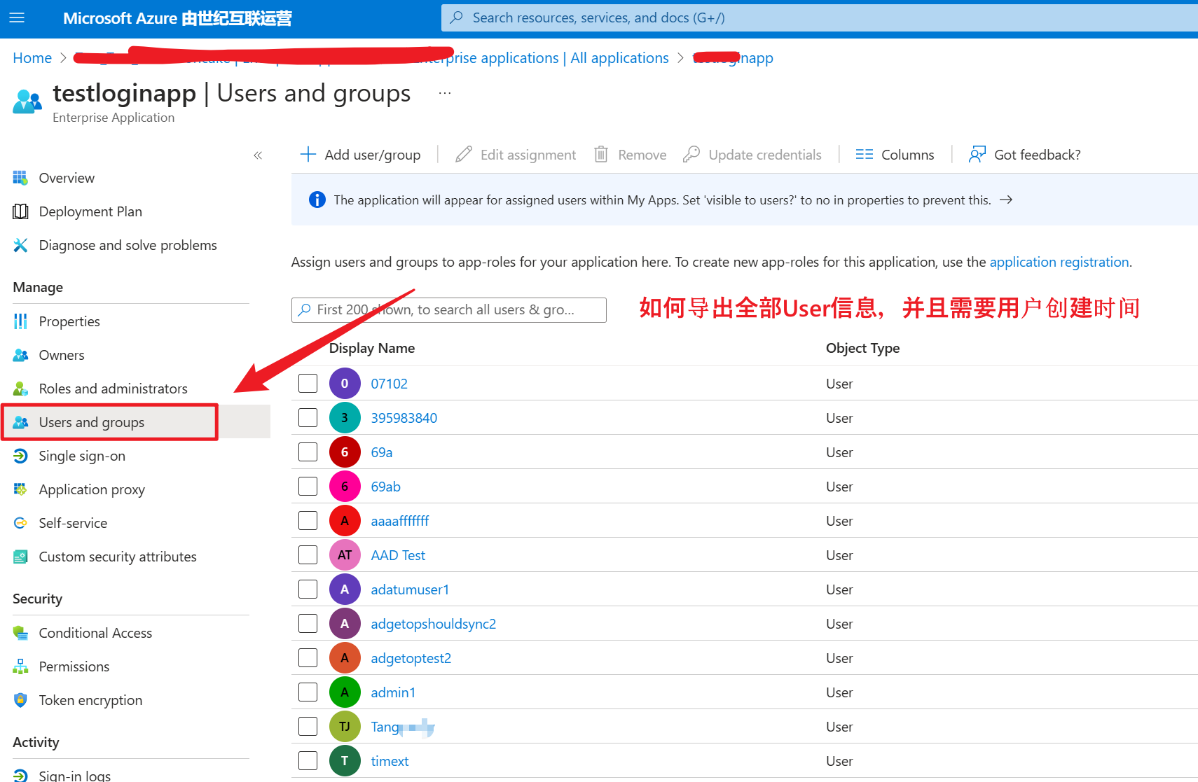 在Azure Entra ID中,需要导出一个Application 下的用户信息, 包含User的创建时间。
