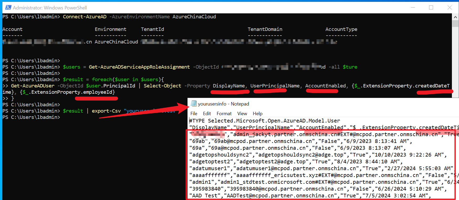 使用 Get-AzureADUser 从 Microsoft Entra ID 获取用户的信息信息,包含 DisplayName, UserPrincipalName, AccountEnabled,createdDateTime 和 employeeId