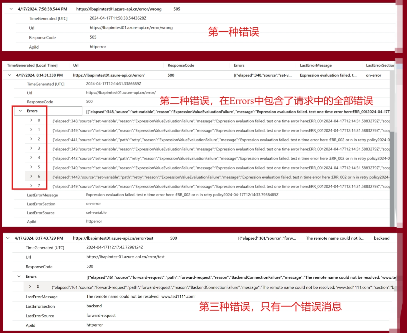 在Log A Workspace中, 查看日志表 ApiManagementGatewayLogs 中所收集的这三种错误日志: