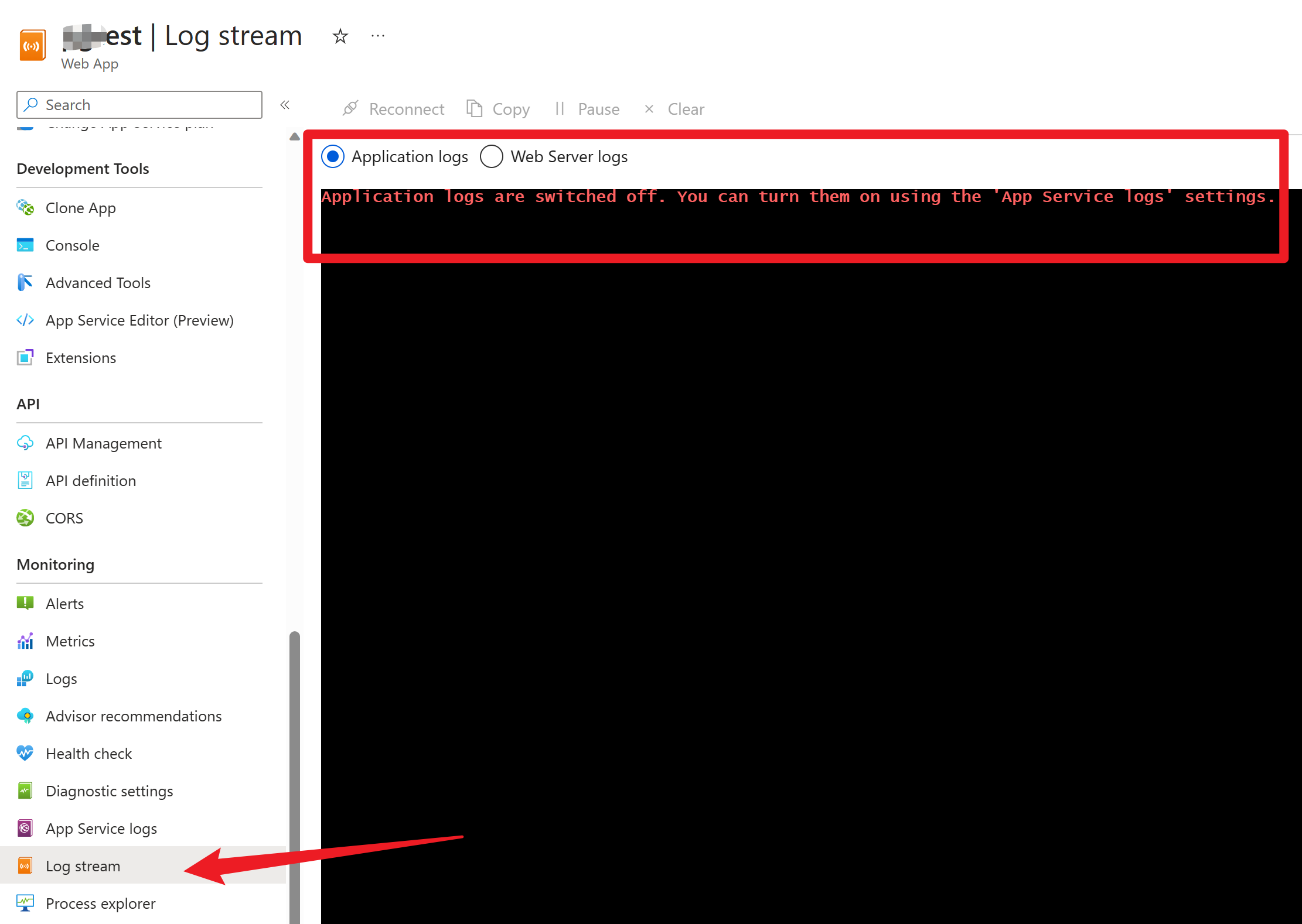 请注意,上图中提示说:Application logs are switched off. You can turn them on using the App Service Logs Settings. 应用日志关闭,可以通过App Service Logs 页面来设置开启。