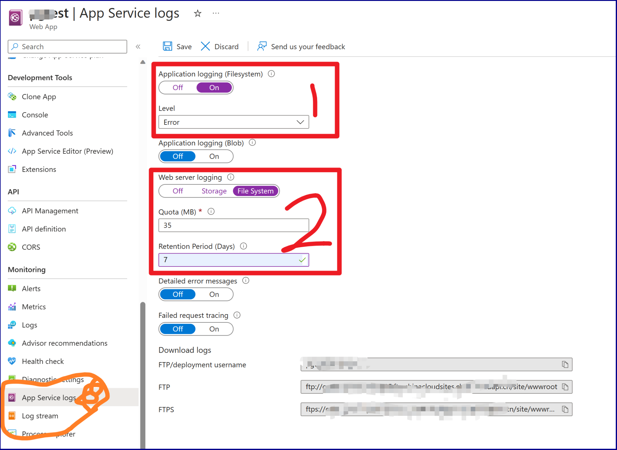 App Service ---> App Service Logs : 针对Application Logging 和 Web Server Logging 为On,最后点击页面上的Save按钮。