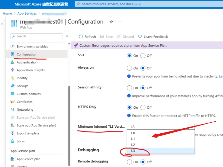 因最近Azure App Service支持TLS 1.3,是不是因为客户端发起的请求还是TLS 1.2,不满足它的要求,所以返回错误WRONG_VERSION_NUMBER.