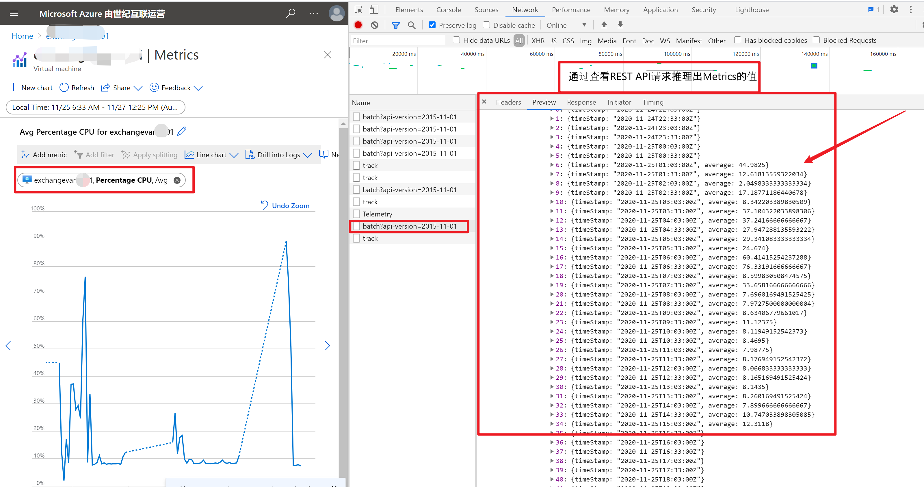 Azure中门户上看见的内容都是通过REST API来获取值,基于此原理,可以通过在门户中Metrics页面中,点看CPU的指标数据后,通过F12(开发者工具),查看具体使用的是什么API, 并参考同样的方式在Java 代码中调用该类接口来完成。