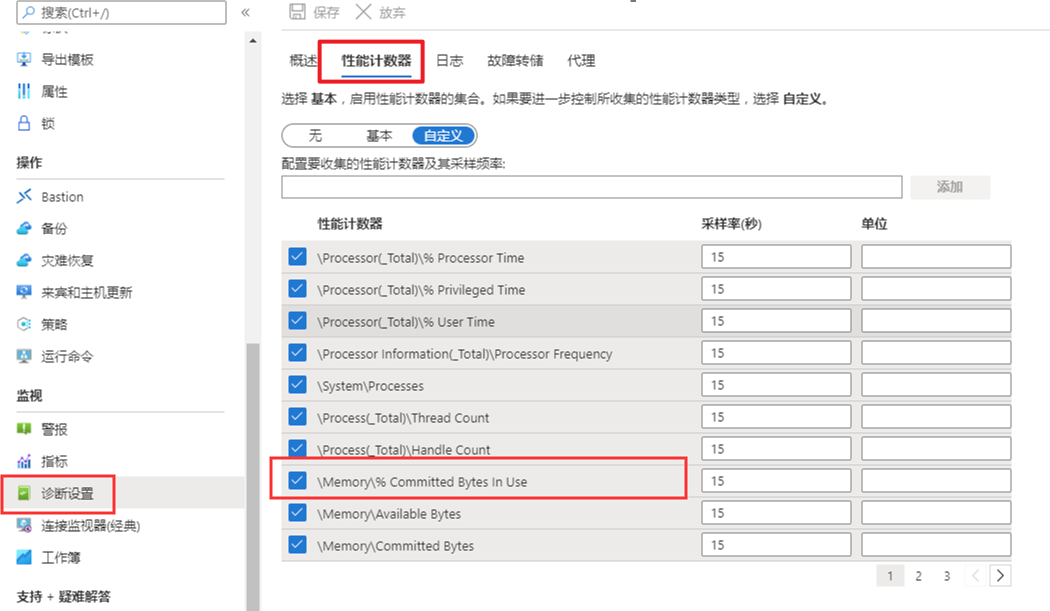 关于VM 的内存使用率,虚拟机本身并没有提供这个指标,需要开启诊断后去Azure Storage表中获取,字段为**\Memory% Committed Bytes In Use**,是开启了诊断日志存储到WADMetrics 表中
