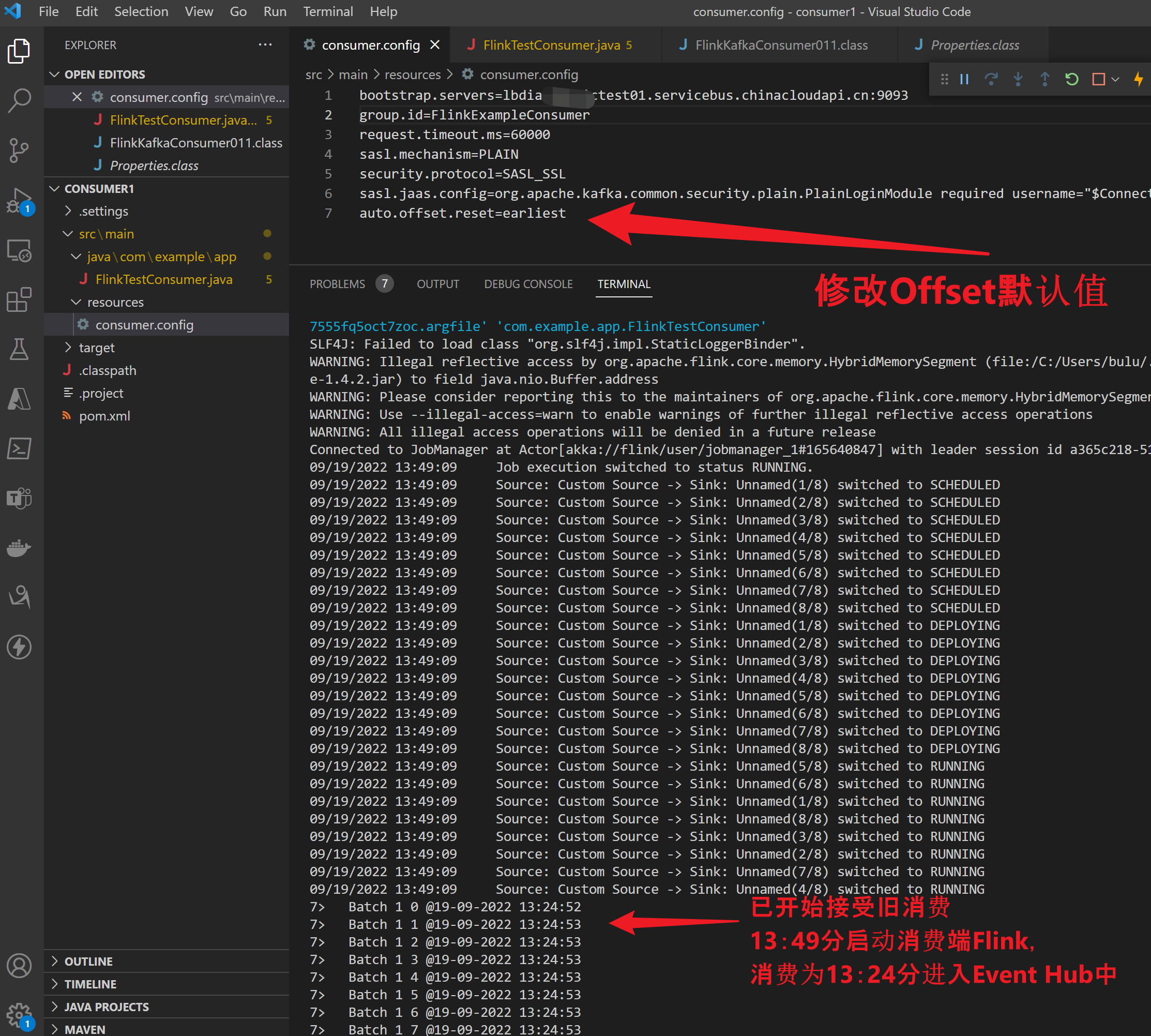 根据Azure Event Hub示例文档,[将 Apache Flink 与适用于 Apache Kafka 的 Azure 事件中心配合使用],配置好 consumer.config 文件后,为什么不能自动消费Event Hub中存储的旧数据呢?