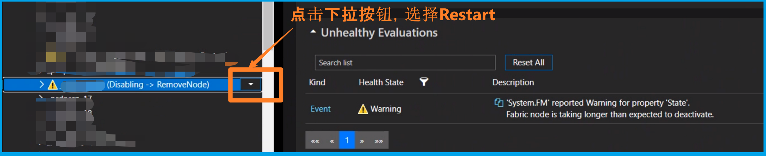 1)通过 Service Fabric Explorer工具,在节点右侧点击“Restart”按钮重启节点